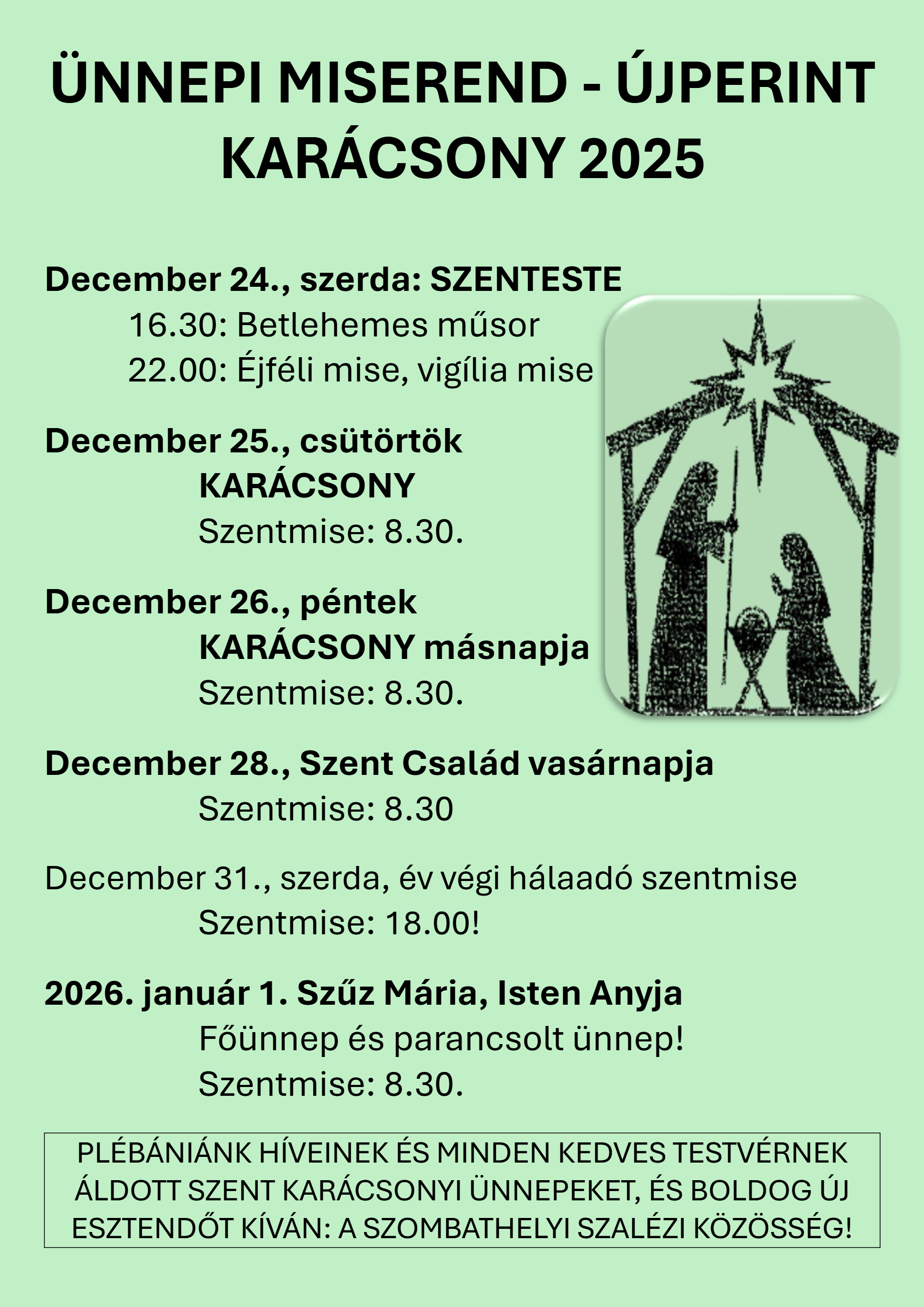 Ünnepi miserend 2025 Karácsony – Segítő Szűz Mária templom – Újperint Szerző: admin | 2025.12.20. | Hirdetések