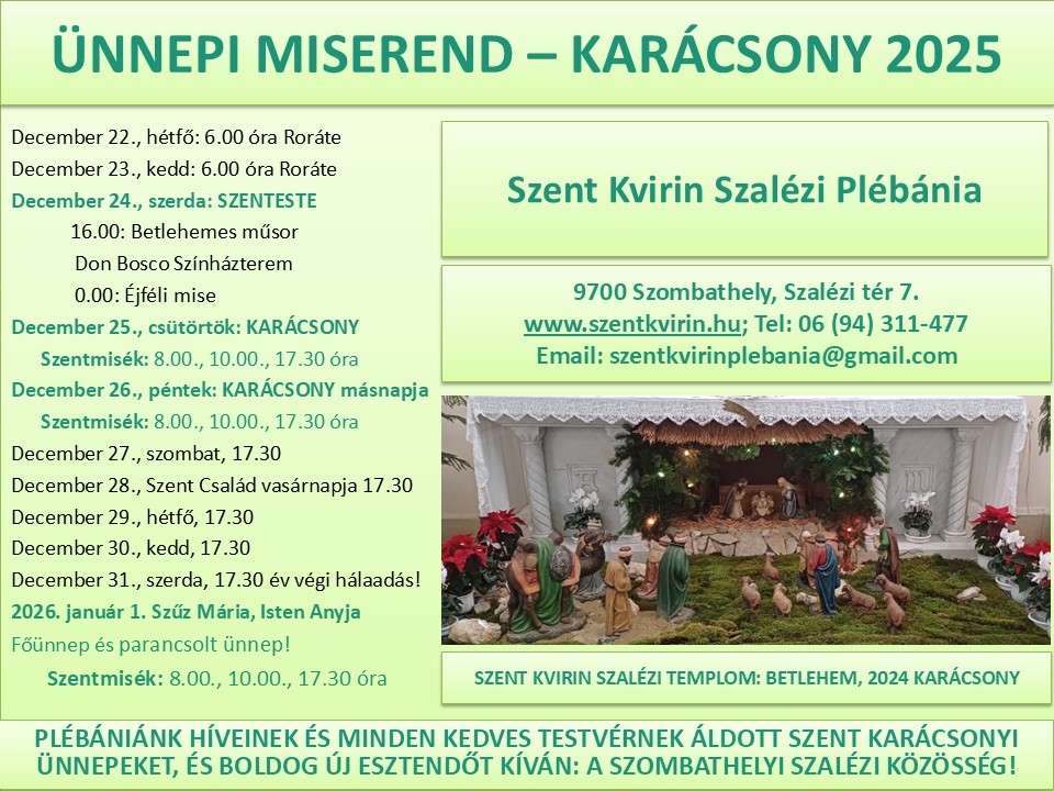 Ünnepi miserend 2025 Karácsony – Szent Kvirin templom