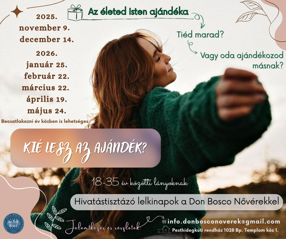 Don Bosco Nővérek – Hivatástisztázó lelkinapok 2025-2026 Szerző: admin | 2025.11.08. | Hirdetések, Programok