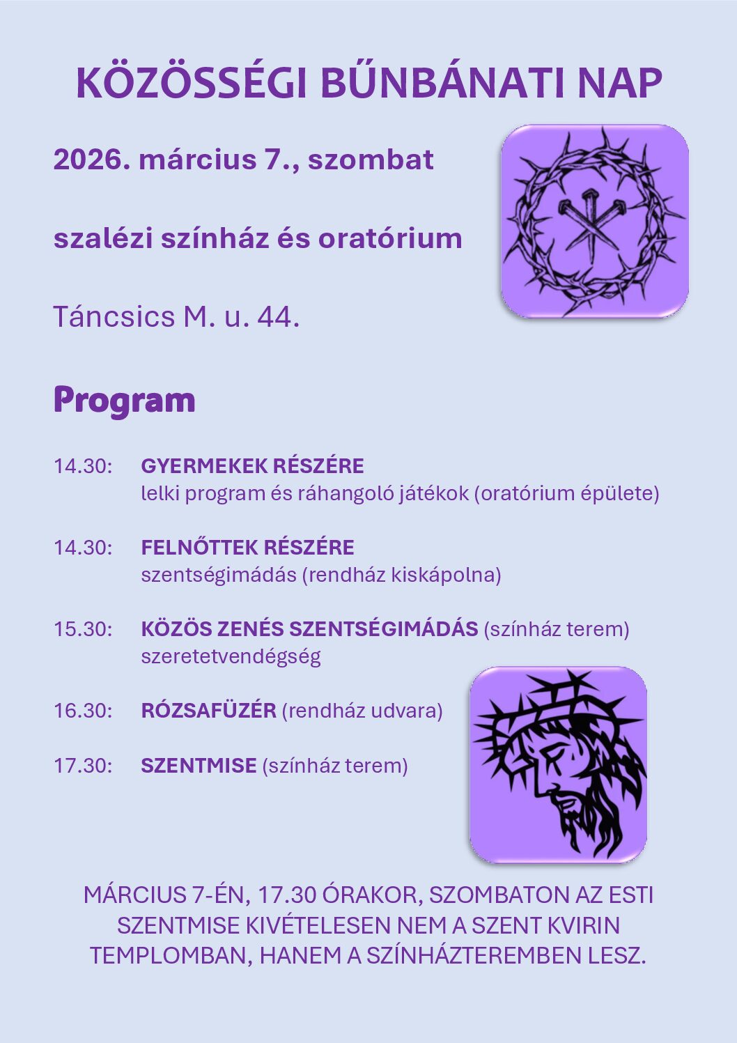 Közösségi Bűnbánati Nap – 2026.03.07. Szalézi Színház Szerző: admin | 2026.02.28. | Hirdetések, Programok