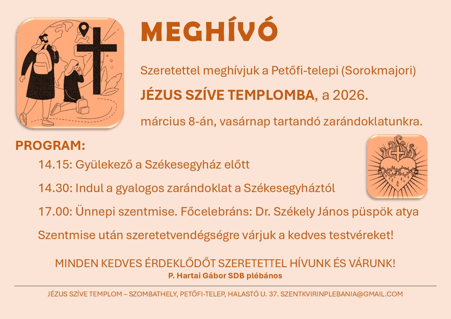 ZARÁNDOKLAT – Jézus Szíve templom (Petőfi-telep) 2026.03.08. Szerző: admin | 2026.03.02. | Hirdetések, Programok
